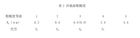 沖裁面的粗糙度用算術(shù)平均值aR 表示。其值一般Ra=0.2~3.6,共分為六個(gè)等級(jí)(見(jiàn)表2),