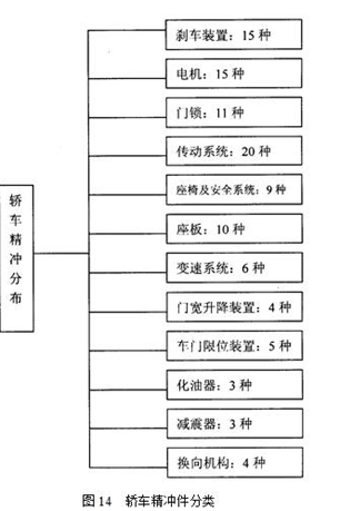精沖工藝技術(shù)的發(fā)展,使其進(jìn)入了各個(gè)工業(yè)領(lǐng)域,得到廣泛的應(yīng)用。對(duì)于要求最小尺寸公差、具有最小粗糙度的功能零件,可以廣泛使用精沖零件。而對(duì)于有視覺(jué)要求的、很精細(xì)的表面零件,也可使用精沖零件。現(xiàn)今,精沖件的生產(chǎn)品種、尺寸形狀、材料厚度和力學(xué)性能都有很大的提高。而且為了適應(yīng)市場(chǎng)需求,生產(chǎn)的均衡性、質(zhì)量可靠性和加工經(jīng)濟(jì)性更加突出。汽車工業(yè)是精沖技術(shù)推廣應(yīng)用的重中之重,一輛轎車精沖零件擁有量為40~200件,它占轎車沖壓件的60~70%,如下圖所示: